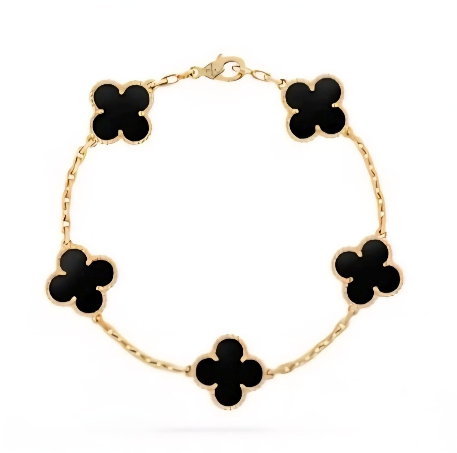 A Pulseira Ellore Black traz a união perfeita entre sofisticação e delicadeza. Com seus elegantes trevos em preto profundo, ela cria um contraste luxuoso com o dourado da corrente, destacando o brilho e a presença da peça no pulso.